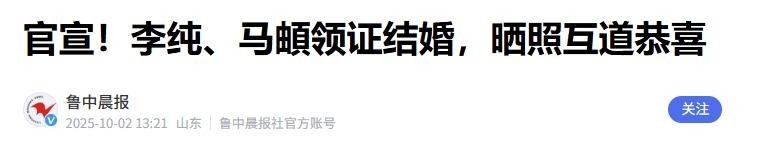 信源来源: 2025.10.2 鲁中晨报 官宣!李纯、马頔领证结婚,晒照互道恭喜