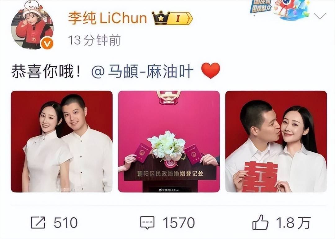 1. 哈喽,各位朋友,小玖最近被李纯的双线热搜深深吸引。一边是她晒出那张红底结婚证照片,与民谣唱作人马頔正式宣布领证喜讯,配文“恭喜你哦”,字里行间透着少女般的甜蜜与克制。